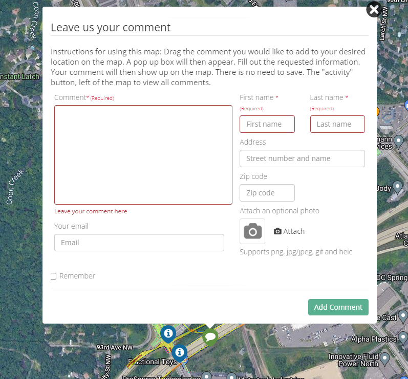 A pop up box will then appear. Fill out the requested information. your comment will then show up on the map. There is no need to save. Our team will address your comment quickly.