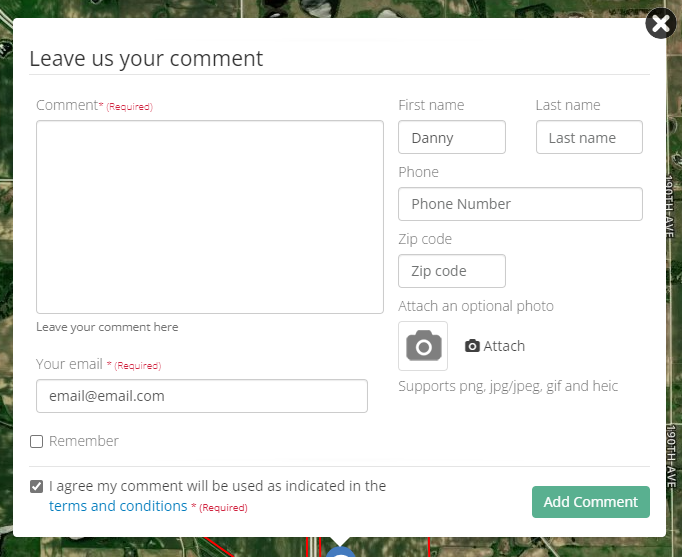 A pop-up box will then appear. Fill out the requested information. Your comment will then show up on the map. There is no need to save. Click the “activity” button left of the map to view all comments.